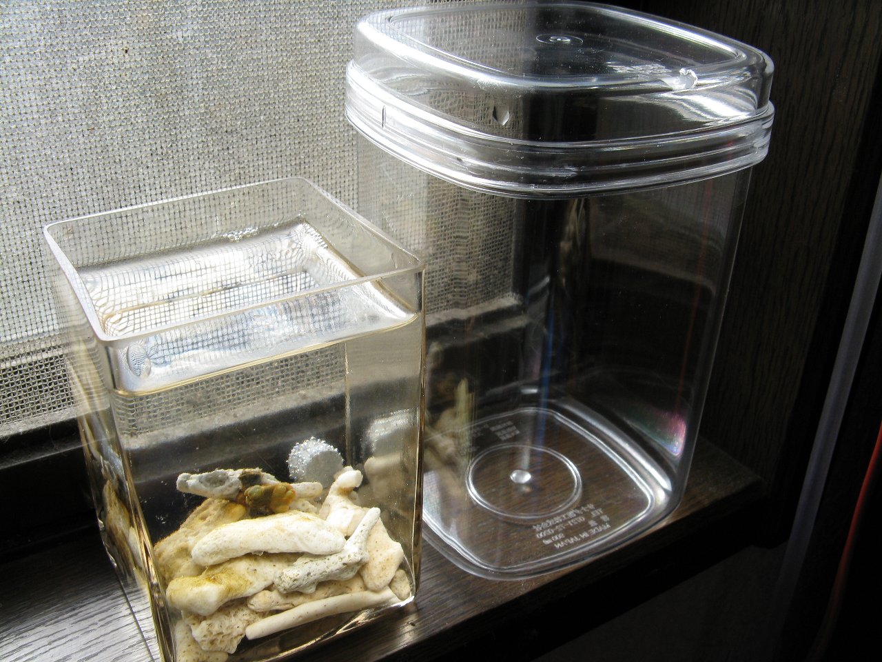 ←左の容器の中身を右の容器に移して飼育していたイソギンチャクがバラバラと剥がれていくんで、水替えとか酸素が出る石を新品に交換してエアレーションもしたんですが効果なし。