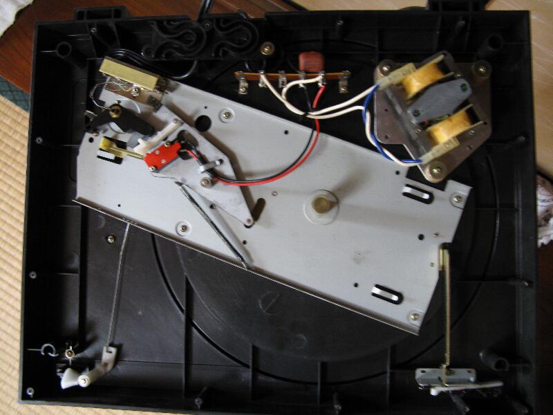 このベルトで動くことはわかったので、一旦取り外して、タンテーブルの裏側を開けました。