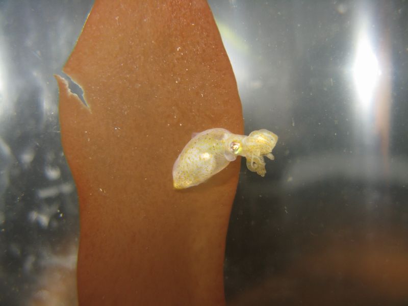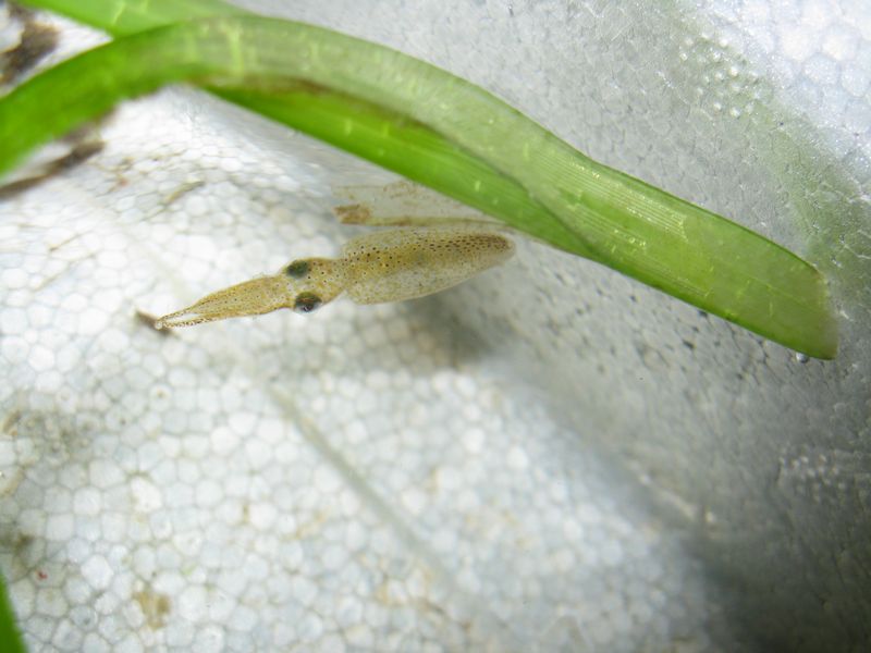 先日、捕ってきたヒメイカですが、5リットルくらいの水槽に入れてエアレーションだけで飼育してます。