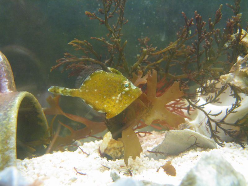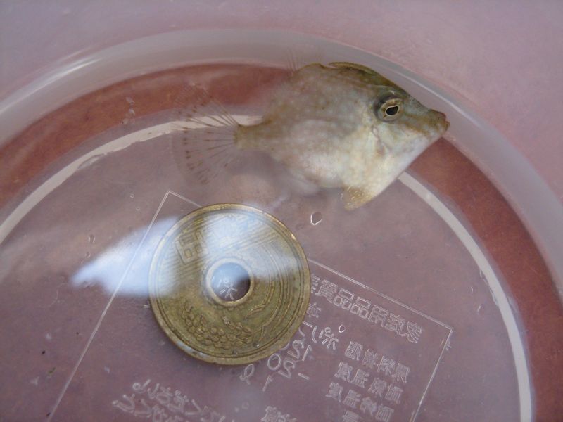 で、このアミメハギ、捕ったときに網の枠でこすれたのか鼻先の皮が薄くなってまして、水槽に入れても弱って駄目になるかと思いましたが、1週間無事に過ごしてます。