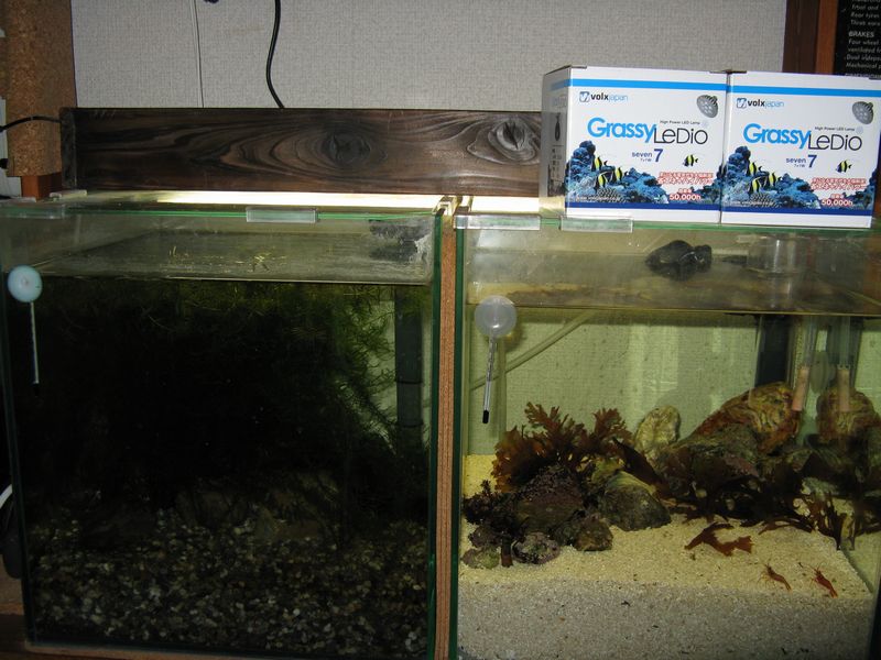 水槽二つ並べて、60cmの蛍光灯で照らしているので、仮に蛍光灯無くすと、隣の淡水水槽の照明がなくなってしまうわけで・・・。