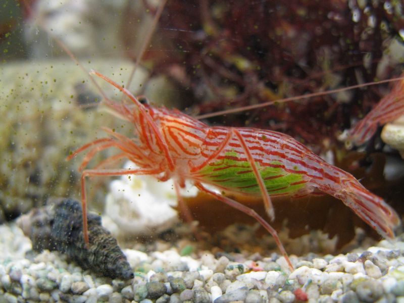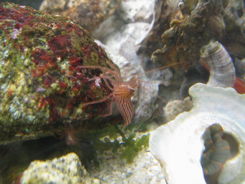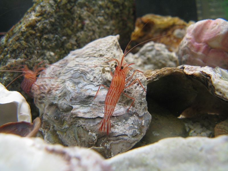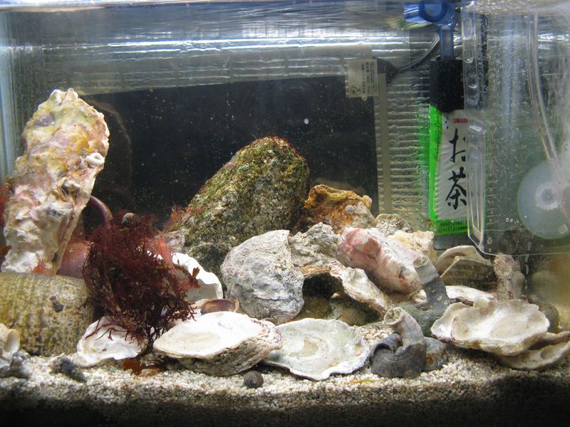 水槽の様子を確認したら、アミメハギの姿が見えず、アカシマモエビとヤドカリは少しでも酸素が多い場所を求めて集団で水面近くへ行こうとしてました。