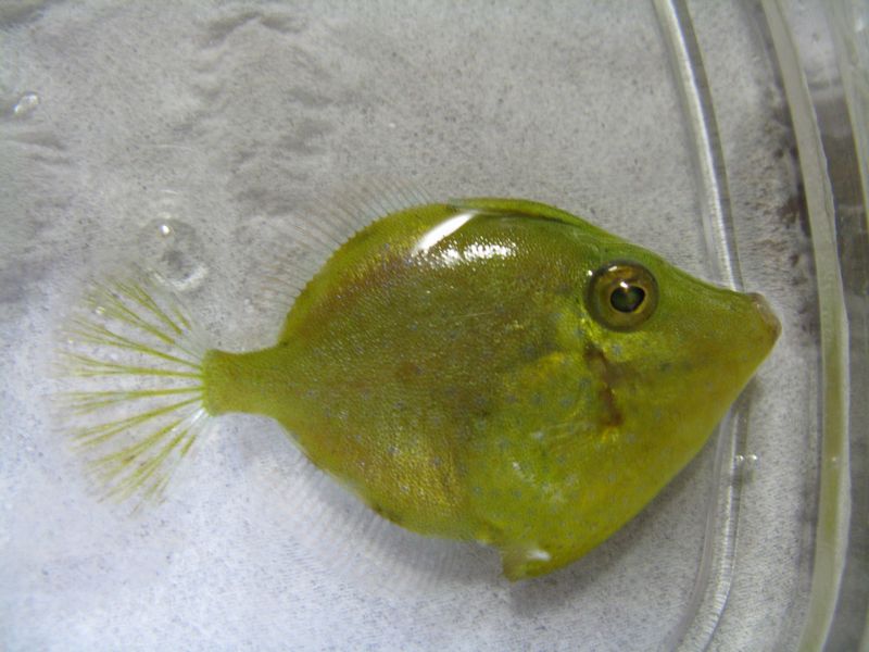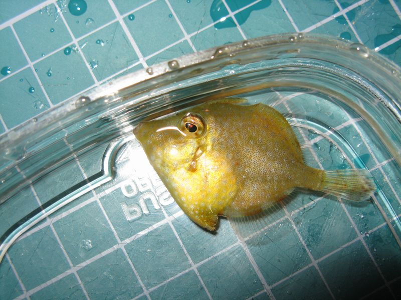 海水魚のサイトの掲示板でも聞いてみたら、「カワハギの稚魚だと思う」とご意見をいただき、コレはカワハギの稚魚ということで、一旦結論づけました。