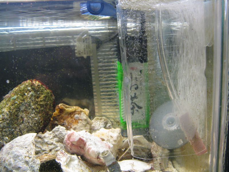 エアレーションは海水の飛散を防ぐため、こんな感じでやってます。(生体を分けるつもりで準備していた水槽につけてたモノです。)