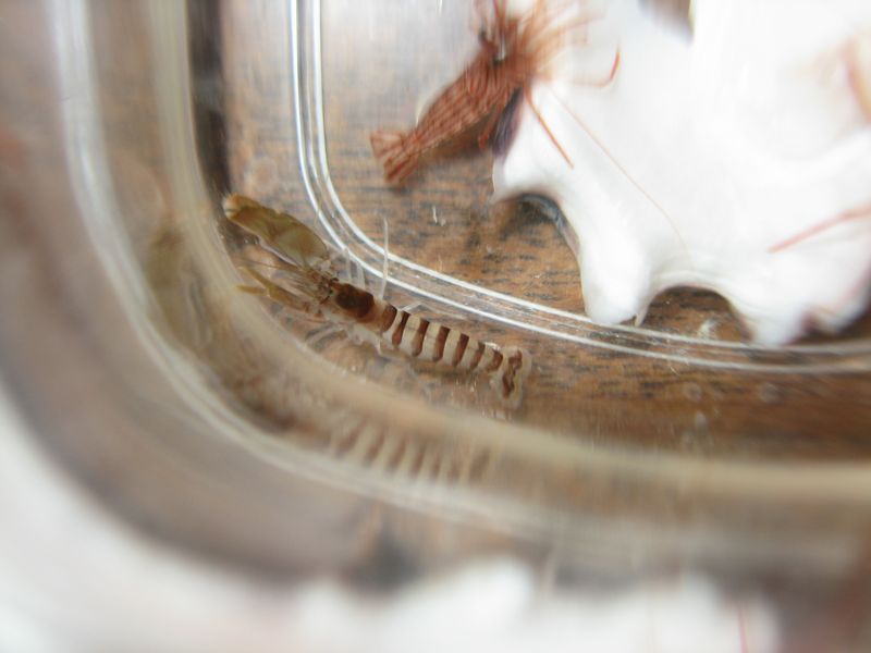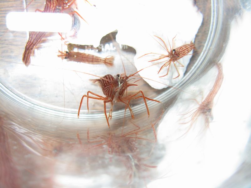 ペットボトルの中のアカシマモエビを見せたら、「コレ、この間来たときにぎょうさんおったけど?」と。