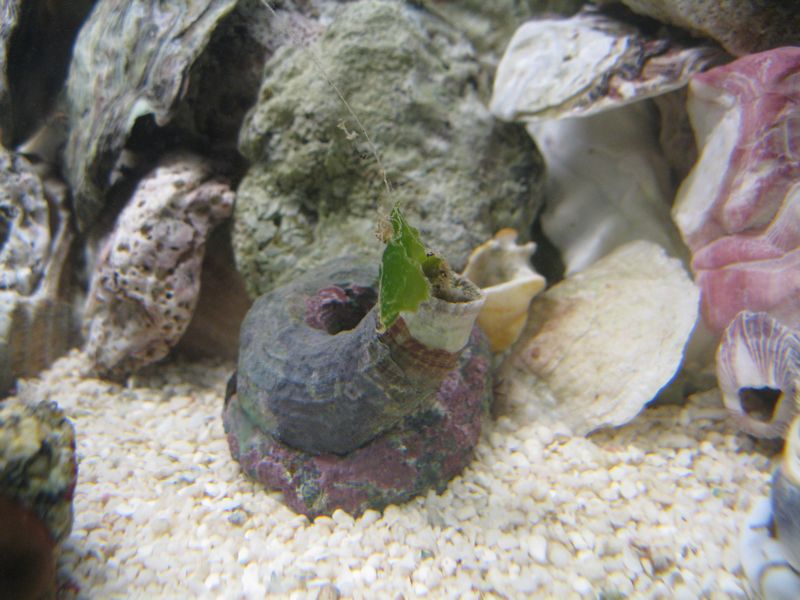 今日、ヤドカリの餌として放り込んでいたアオサを取り出そうとしたら、ヘビガイの捕獲用の粘液?にアオサが引っ掛かりまして、ヘビガイがアオサを食べはじめました。