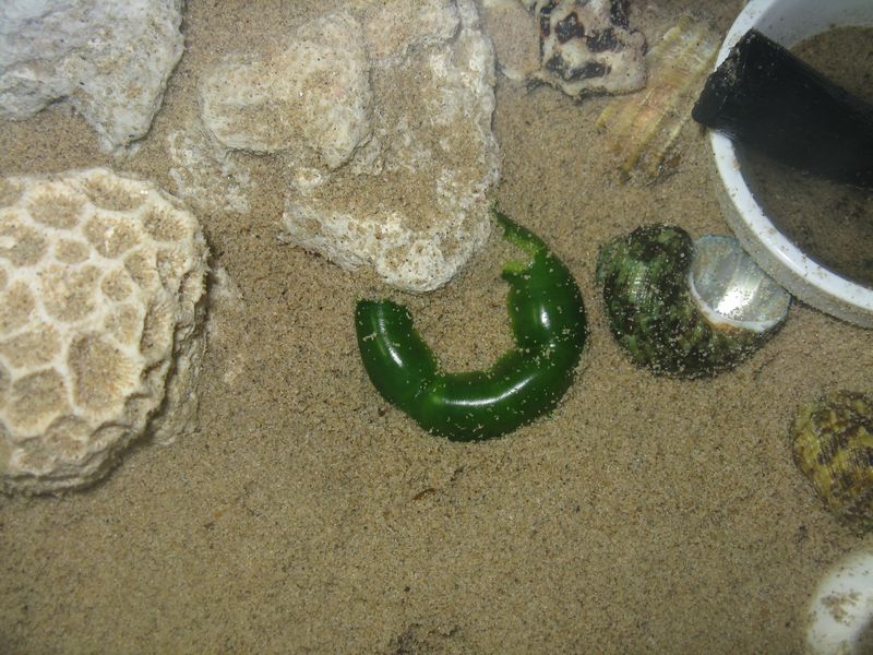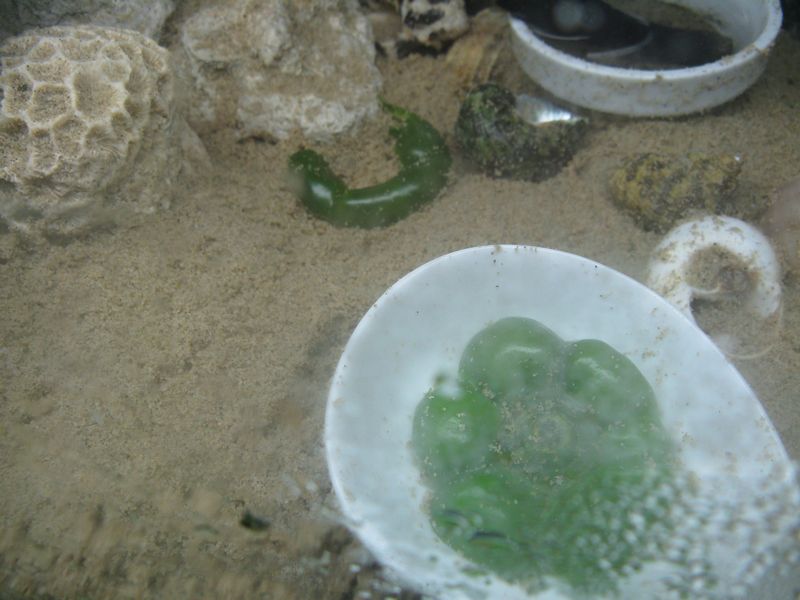 サンゴ砂に黒く変色してる部分があったので、硫化水素が悪さしてるかもしれないと、他の飼育瓶へイソギンチャクを移してみましたが、それも効果なし。