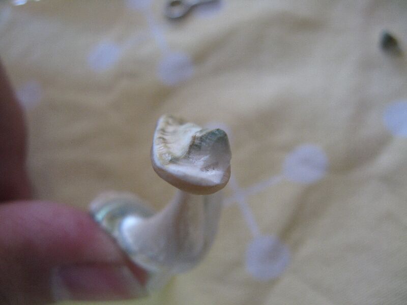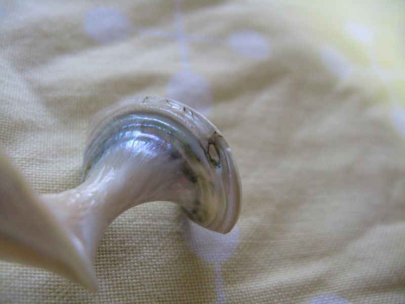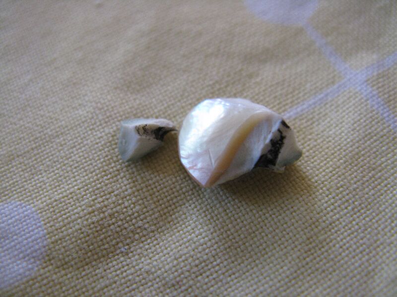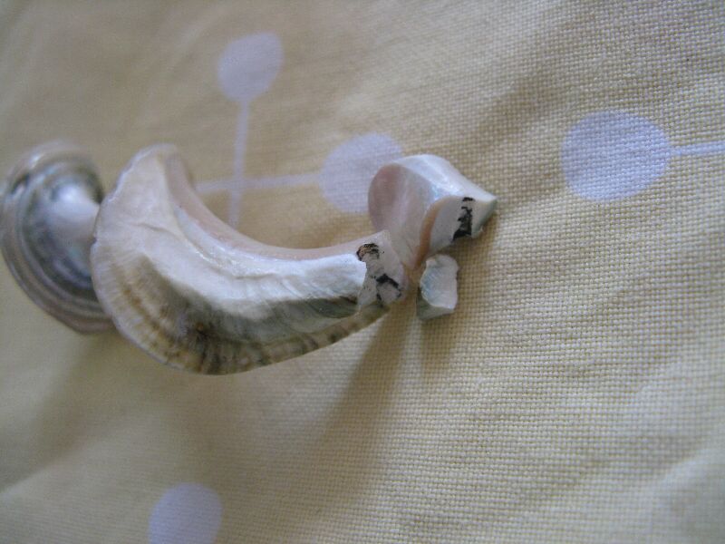 はじめは右の大きな破片だけだったんですが、瞬間接着剤つかって修復して、金具を通そうとしたらまた割れまして、小さい破片もできました。