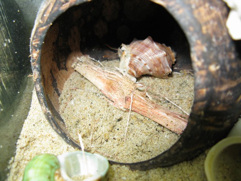 サトウキビ、買って・切って・冷凍して、しばらくは餌として与えていたんですが、すっかり存在を忘れてました。 昨日、その存在を思い出して、餌入れに入れてみました。 今日、餌の交換をしようとしたら、餌入れ付近にサトウキビの姿がありません。 一緒に入れていた煮干は餌入れ付近に散乱しているのに。 水槽の中を探してみたら、こんなところにありました。 結構な距離を移動してます。 かなり人気があったみたいです。