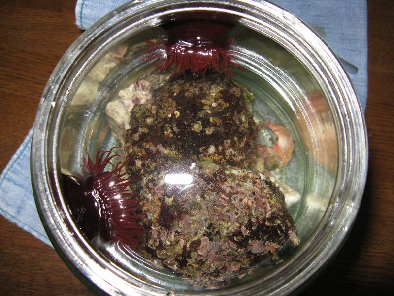 ヤドカリのことも書きたいのですが、じっくり水槽を観察する精神的余裕がないので、今日はウメボシイソギンチャクを飼育しているビンのことを書こうかと思います。